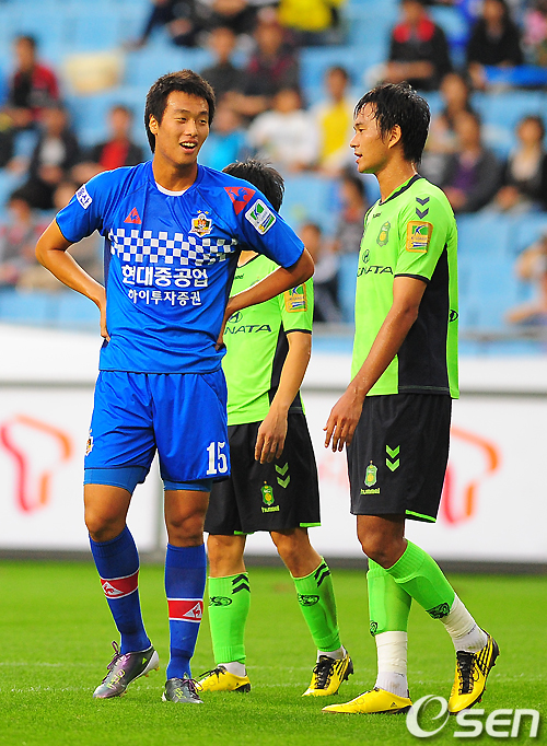 전반 울산 김신욱과 전북 심우연이 이야기를 나누고 있다. /jpnews@osen.co.kr