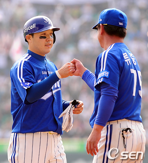 1회초 1사 만루서 2타점 적시타를 친 박진만이 이닝을 마치고 류중일 코치와 주먹을 마주치고 있다. /spjj@osen.co.kr