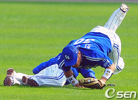 1회말 무사 주자 1루 두산 오재원의 좌중간 안타때 삼성 유격수 김상수의 다이빙 캐치 실패 후 좌익수 최형우가 김상수에게 걸려넘어지고 있다. /rumi@osen.co.kr