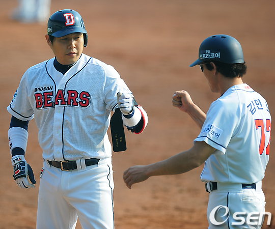 2회말 무사 주자 2루 두산 양의지가 중전 1타점 적시타를 날린 후 1루에서 기뻐하고 있다. /rumi@osen.co.kr