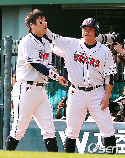 3회말 1사 1,3루 김현수가 병살타를 치고 아쉬워 하자 김동주가 격려해주고 있다. /spjj@osen.co.kr