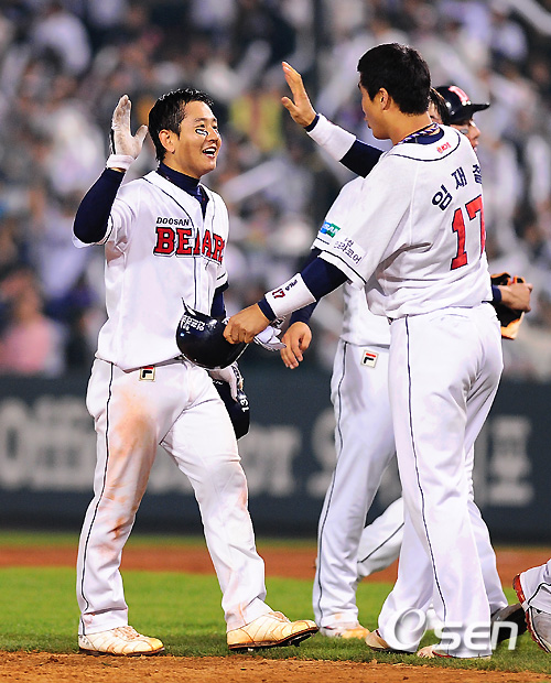 끝내기 안타를 친 손시헌이 동점타를 친 임재철과 하이파이브를 하고 있다. /spjj@osen.co.kr