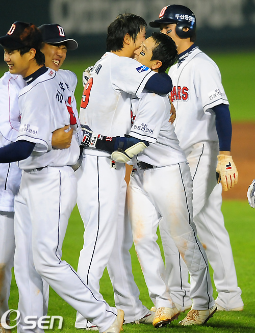 연장 11회말 무사 주자 2,3루 두산 손시헌 끝내기 안타를 날린 후 동료들과 기쁨을 나누고 있다./rumi@osen.co.kr