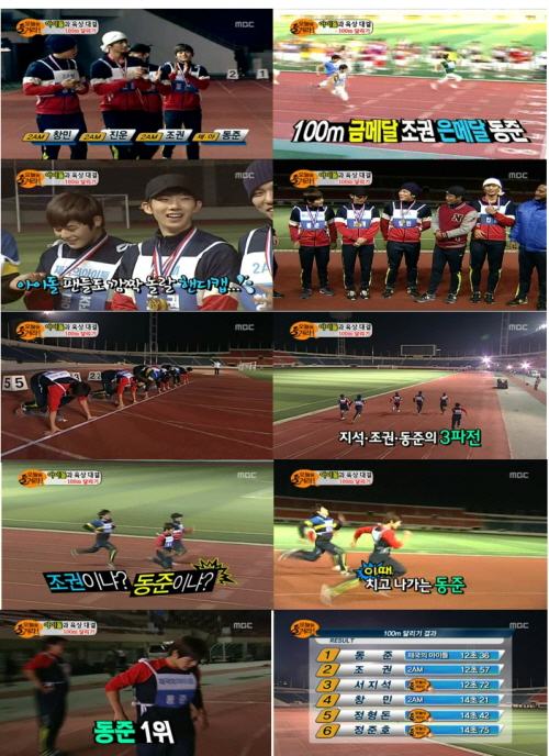 그동안 각종 예능 프로그램에서 뜀틀, 축구 등 다방면의 분야에서 두각을 드러내며 '운동돌'로 급부상했던 동준은 100m 달리기에 출전해 손에 땀을 쥐게 하는 경기를 펼치며 12.36이라는 경이적인 기록으로 당당하게 1등을 거머쥐었다.