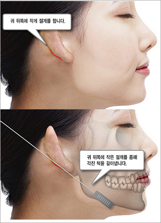 이 수술의 정식 의학용어는 ‘귀 뒤 접근 사각턱 성형술’이며, 2004년 8월에 처음 개발되어 2006년 대한 성형외과학회에서 정식으로 발표 된 수술이다. 이 수술의 특징은 그간의 사각턱 수술과 달리 전신마취가 아닌 국소마취로 수술이 진행된다는 점이며, 귀 뒷부분을 작게 절개하여 각진 뼈 부분만 제거 한 후 봉합하는 방식으로 진행된다.