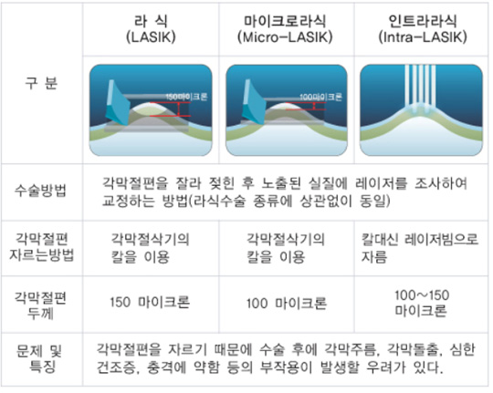 다만, 레이저의 발달로 인해 이전보다 각막절편이 좀 더 정교하고 얇게 만들 수 있다는 것이지 실질부위가 아닌 상피부분만을 잘라내는 것이 아니다. 그렇기 때문에 잘린 각막실질은 수술 전처럼 완벽하게 붙지 않을 것이고 이로 인해 발생하던 부작용들은 동일하다고 봐야 한다.