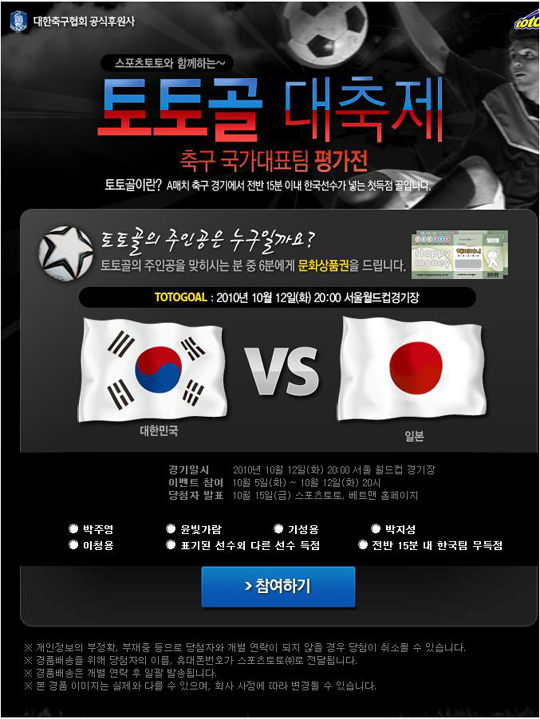 '토토골 대축제'는 A매치 경기를 대상으로 한국선수 가운데 전반 15분 이내 첫 번째로 골을 기록하는 선수를 맞히는 이벤트다. 이번 한일전에서는 박지성(잉글랜드 프리미어리그, 맨체스터 유나이티드) 박주영(프랑스리그, AS모나코), 이청용(잉글랜드 프리미어리그, 볼튼), 윤빛가람(K-리그, 경남) 등이 선정됐고 기타(표기된 선수 이외에 다른 선수가 득점)와 15분내 한국팀 무득점도 예상 항목에 포함됐다.