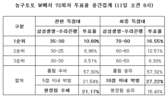 2010-2011 시즌 농구토토 W매치 72회차 투표율 중간집계 결과