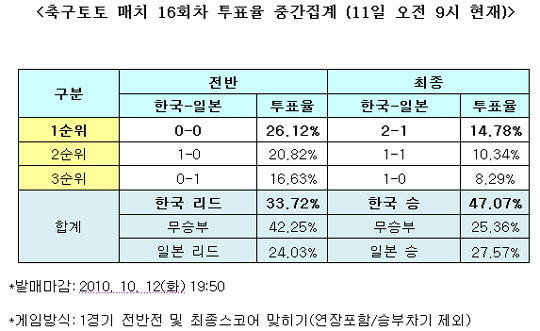 전반전 스코어의 경우는 0-0 무승부 예상이 26.12%로 가장 높았으며 뒤를 이어 1-0 한국 리드 20.82%, 1-0 일본 리드 16.63%의 비율을 보였다. 이번 축구토토 매치 16회차는 12일 오후 7시 50분 발매 마감된다.