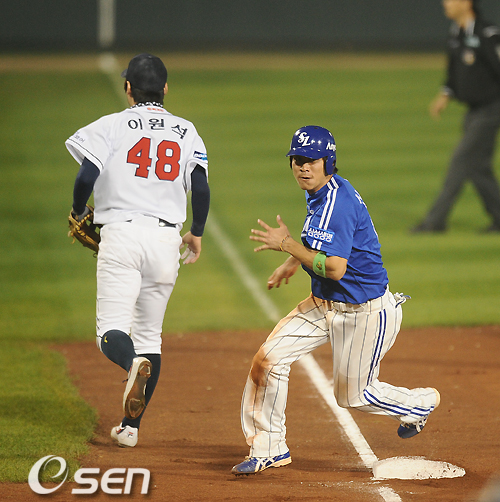 11일 잠실 경기장에서 열린 '2010 CJ 마구마구 프로야구 플레이오프 4차전' 삼성 라이온즈와 두산 베어스 경기 3회초 무사 1,2루 김상수 투수앞 희생번트때 두산 선발 홍상삼의 3루 송구때 볼이 빠지면서 2루주자 신명철 세이프가 되면서 홈까지 진루하고 있다./ ajyoung@osen.co.kr