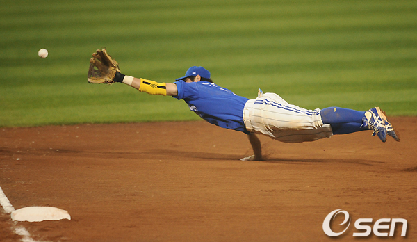 11일 잠실 경기장에서 열린 '2010 CJ 마구마구 프로야구 플레이오프 4차전' 삼성 라이온즈와 두산 베어스 경기 4회말 무사 2루 김동주 좌선상을 스치는 적시타때 삼성 조동찬 3루수가 다이빙캐치를 하였으나 1타점 적시타를 허용하고 있다./ ajyoung@osen.co.kr