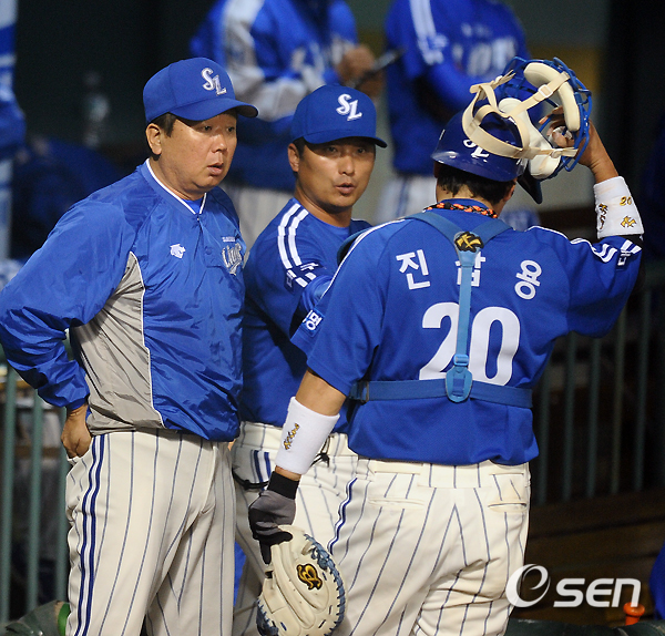 11일 잠실 경기장에서 열린 '2010 CJ 마구마구 프로야구 플레이오프 4차전' 삼성 라이온즈와 두산 베어스 경기 4회말 무사 1,3루 임재철을 볼넷으로 진루시키며 만루 위기상황이 되자 선동렬 감독이 진갑용 포수를 불러놓고 이야기를 나누고 있다./ ajyoung@osen.co.kr