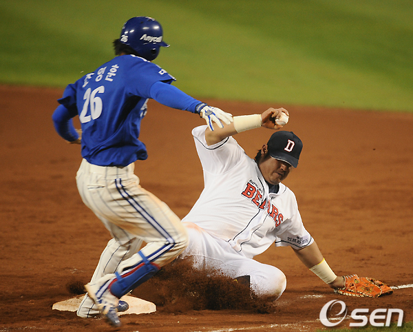 11일 잠실 경기장에서 열린 '2010 CJ 마구마구 프로야구 플레이오프 4차전' 삼성 라이온즈와 두산 베어스 경기 5회초 2사 1,2루 조영훈 1루강습 타구때 두산 최준석 1루수가 포구 햐며 포스아웃 처리를 하였으나 안타를 허용하고 있다./ ajyoung@osen.co.kr
