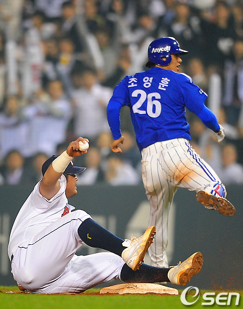 11일 잠실구장에서 열린 '2010 CJ마구마구 프로야구' 플레이오프 4차전 삼성 라이온즈와 두산 베어스 경기, 5회초 2사 1,2루에서 두산 최준석과 삼성 조영훈이 1루 베이스을 밟고 심판을 바라보고 있다. 삼성 조영훈은 1루에서 세이프. / jpnews@osen.co.kr