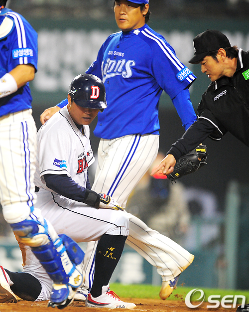 자신을 잡기 위해 날아드는 송구는 볼 수 없었으나 포수가 어떤 위치에서 자리를 지키고 있는지는 알 수 있던 순간. 접전 타이밍이 되었더라도 김동주가 뒤로 돌아 베이징 올림픽 때의 슬라이딩을 보였더라면 진갑용의 포구 후 태그 동작에 한 박자가 더해져 충분히 세이프 판정을 얻을 수 있었다.