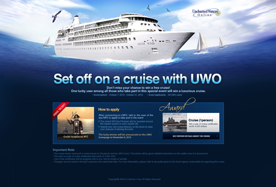 역사 항해 시뮬레이션 게임답게 크루즈 여행 상품을 내걸고 현재 이벤트를 진행, 참여 열기가 뜨겁다. 단 한 명의 유저에게만 제공되지만 $4000 상당의 럭셔리 상품으로 흔치 않은 기회인데다 게임에 접속해 크루저 접수원 NPC와 대화를 하면 이벤트에 자동으로 참여되는 간단한 방식이라 참여자가 더욱 몰리고 있는 것으로 보여진다.