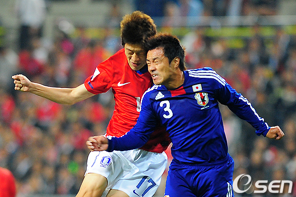 전반 한국 이청용이 문전에서 공중볼을 다투다 일본 고마노와 머리를 부딪히고 있다. /jpnews@osen.co.kr