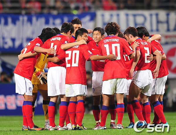 후반전이 시작되기 전 이영표가 선수들을 불러모아 정신무장을 시키고 있다. /spjj@osen.co.kr
