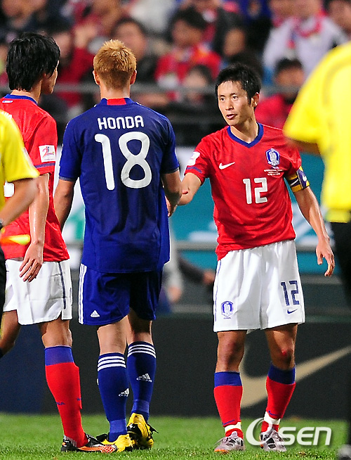 이영표가 혼다와 인사를 나누고 있다. /spjj@osen.co.kr