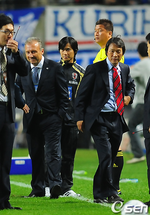경기후 일본 자케로니 감독과 한국 조광래 감독이 인사를 나누고 돌아서고 있다. /jpnews@osen.co.kr