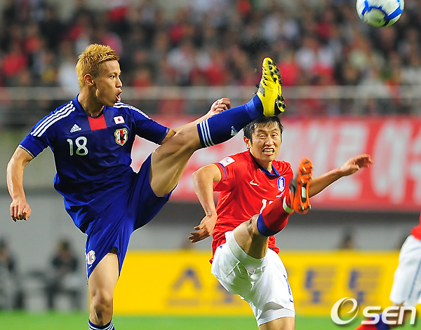 후반 일본 혼다와 한국 이영표가 볼을 다투고 있다. /jpnews@osen.co.kr