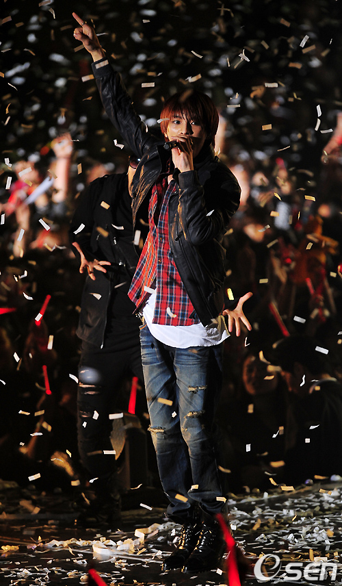 JYJ의 재중이 꽃비를 맞으며 열창을 하고 있다./rumi@osen.co.kr