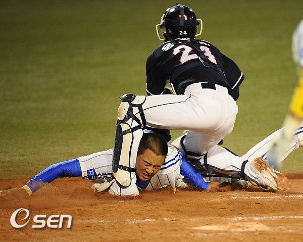 홈 플레이트 슬라이딩 논란은 두 차례 있었다. 먼저 지난 7일 대구구장에서 열린 삼성과 두산의 플레이오프 1차전 3회말 2사 1,2루 최형우 적시타 때 2루 주자 채태인 홈까지 쇄도하였으나 두산 용덕한 포수에게 태그아웃 됐다.