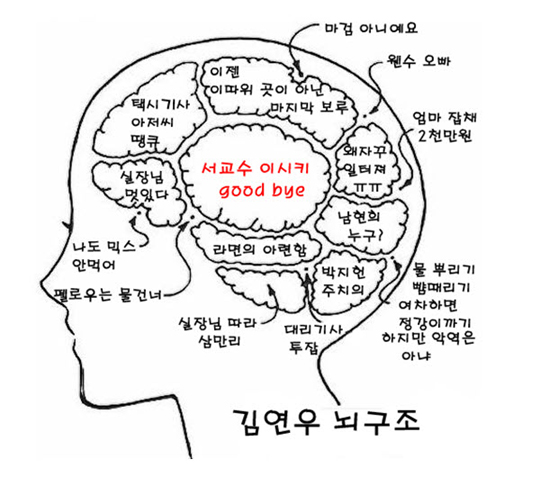 초반부에 등장했던 드라마 에피소드 중 가장 큰 갈등의 축이던 서교수에 대한 원망으로 이별을 선언하는 부분이 머리를 꽉 채우고 있는 김연우의 상태를 보여주는 뇌구조 이미지는 중간중간 김연우의 엉뚱하고 버럭대는 성격을 보여주면서 보는 사람의 웃음을 자아내게 하고 있다.