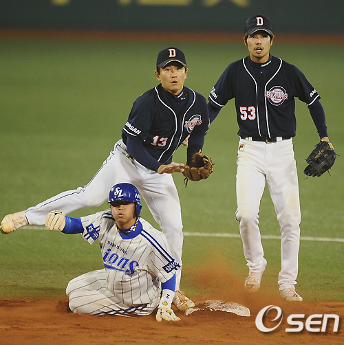 13일 잠실 경기장에서 열린 '2010 CJ 마구마구 프로야구 플레이오프 5차전' 삼성 라이온즈와 두산 베어스 경기 3회말 1사 1,3루 상황에서 조동찬 내야땅볼때 두산 손시헌 유격수 1루 주자 김상수를 포스아웃 시키며 병살처리 시키고 있다./ ajyoung@osen.co.kr