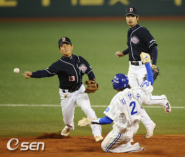 13일 잠실 경기장에서 열린 '2010 CJ 마구마구 프로야구 플레이오프 5차전' 삼성 라이온즈와 두산 베어스 경기 3회말 1사 1,3루 상황에서 조동찬 내야땅볼때 두산 손시헌 유격수 1루 주자 김상수를 포스아웃 시키며 병살처리 시키고 있다./ ajyoung@osen.co.kr