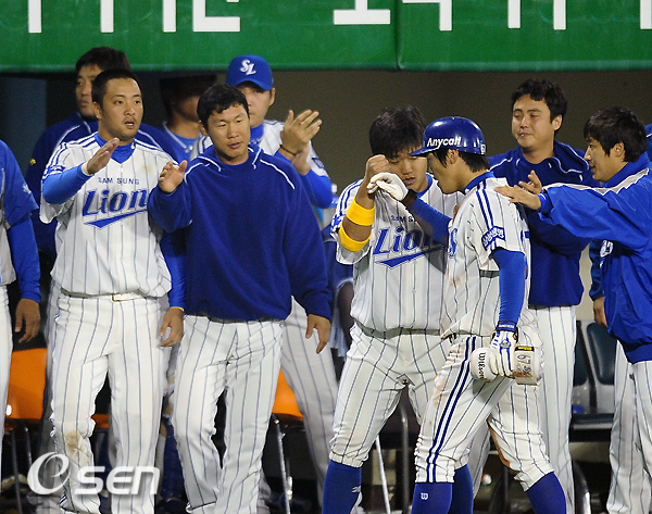 13일 잠실 경기장에서 열린 '2010 CJ 마구마구 프로야구 플레이오프 5차전' 삼성 라이온즈와 두산 베어스 경기 6회말 무사 1루 이영욱 좌익수 키를 넘기는 동점 적시타를 날리고 3루끼지 뛰었으나 태그아웃 처리되며 덕아웃을 향하며 동료들의 축하를 받고 있다./ ajyoung@osen.co.kr