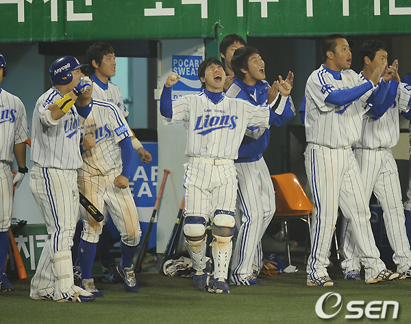 13일 잠실 경기장에서 열린 '2010 CJ 마구마구 프로야구 플레이오프 5차전' 삼성 라이온즈와 두산 베어스 경기 삼성이 연장 11회말 1사 2루 임태훈의 와일드 피칭때 2루 주자 김상수 3루에 세이프 되자 삼성 선수들이 환호하고 있다./ ajyoung@osen.co.kr