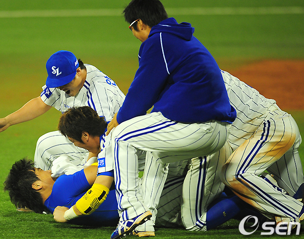 <사진>13일 대구구장에서 열린 '2010 CJ마구마구 프로야구' 플레이오프 5차전 경기, 11회말 2사 만루에서 삼성 박석민이 끝내기 안타를 날리고 동료선수들과 기뻐하고 있다. /OSEN=대구,지형준 기자 jpnews@osen.co.kr