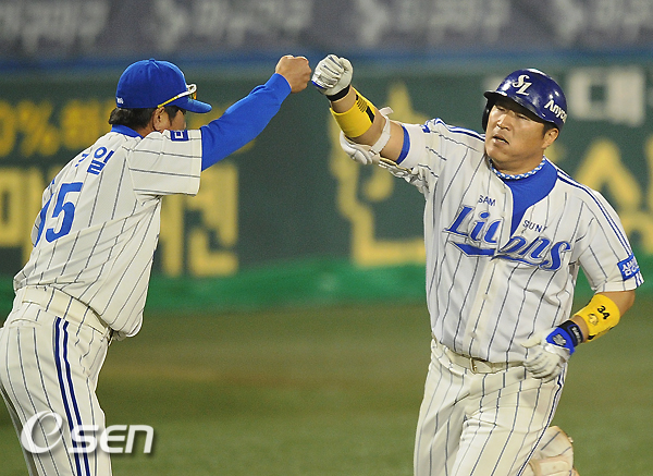 <사진>13일 잠실 경기장에서 열린 '2010 CJ 마구마구 프로야구 플레이오프 5차전' 삼성 라이온즈와 두산 베어스 경기 4회말 1사 1루 최형우 우월투런 홈런을 닐리고 류중일 코치의 환영을 받으며 홈인하고 있다./OSEN=대구,김영민 기자 ajyoung@osen.co.kr