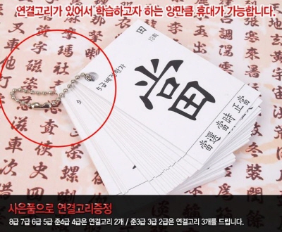 특히 카드앞면에는 부수와 횟수 한자, 활용한자가 있고 뒷면에는 한자의 훈과 음, 활용한자의 음 그리고 활용한자 뜻풀이가 나와 있으며, 가로 5.5cm 세로 7.5cm의 작은 크기로 휴대가 간편해 언제 어디서든 간편하게 한자공부를 할 수 있다.