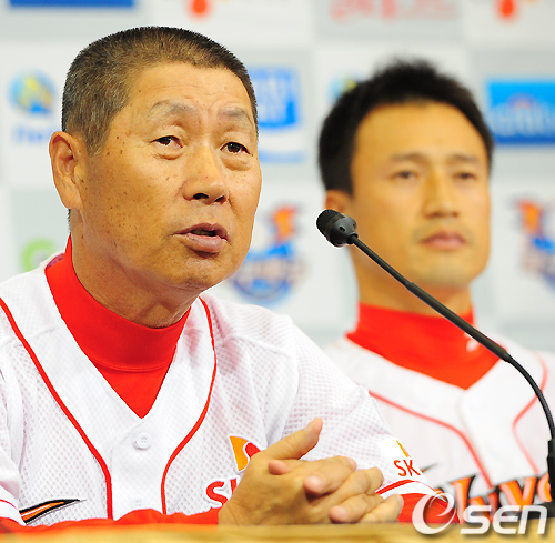 14일 오후 인천 문학월드컵컨벤션센터 미추홀에서 열린 2010 프로야구 한국시리즈 미디어데이에서 SK 김성근 감독이 질문에 답을 하고 있다.