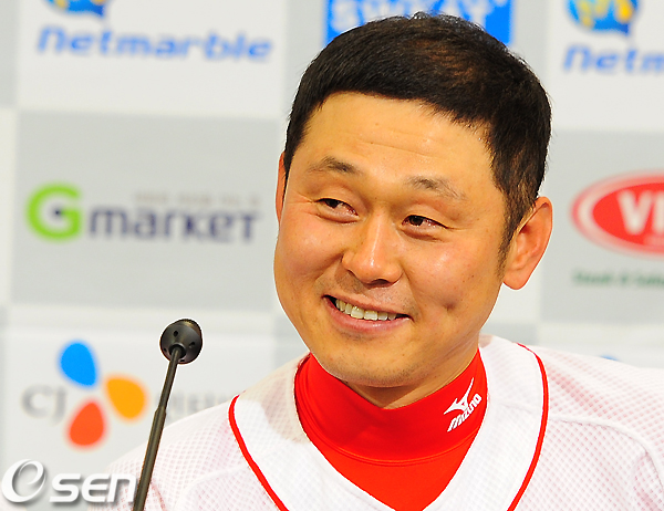 14일 오후 인천 문학월드컵컨벤션센터 미추홀에서 열린 2010 프로야구 한국시리즈 미디어데이에서 SK 박경완이 질문에 답을 하고 있다.