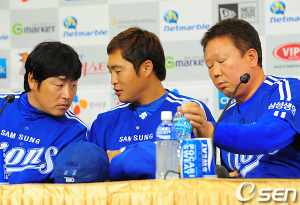 14일 오후 인천 문학월드컵컨벤션센터 미추홀에서 열린 2010 프로야구 한국시리즈 미디어데이에서 삼성 선동렬 감독이 옆구리를 만지며 아파하자 진갑용 박한이가 걱정스런 눈빛으로 이야기를 나누고 있다.