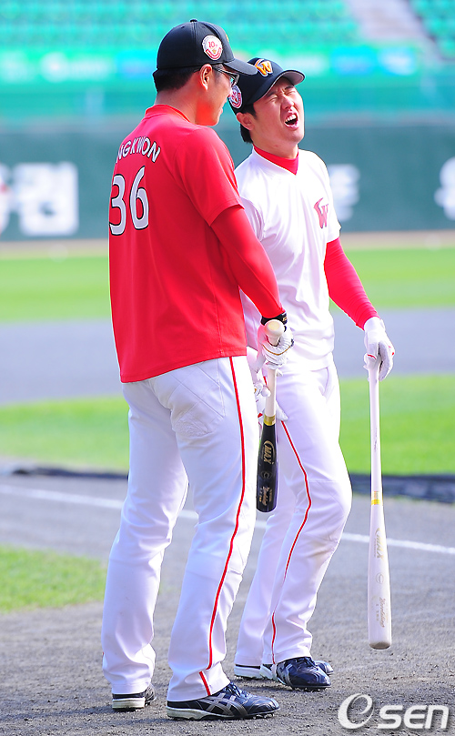 훈련 중 SK 박정권이 최정을 배트로 치며 장난을 치고 있다./rumi@osen.co.kr