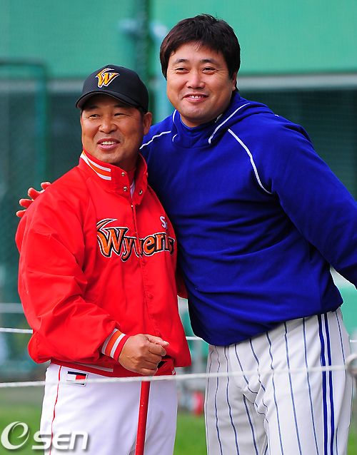 경기 전 SK 이만수 코치와 삼성 양준혁이 다정하게 얘기를 나누고 있다./rumi@osen.co.kr