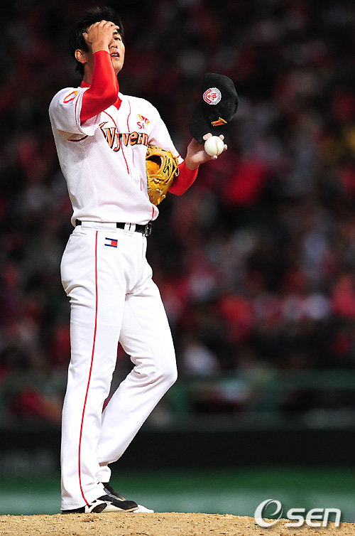 5회초 2사 1루 박한이에게 역전타를 맞고 이어 김상수를 볼넷으로 내보낸 김광현이 아쉬워 하고 있다. 정우람으로 교체됐다. /spjji@osen.co.kr