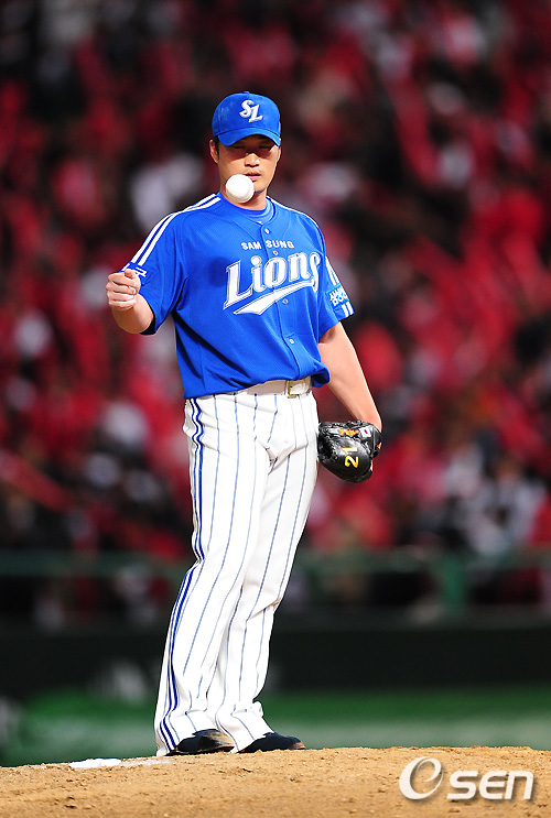 5회말 2사만루서 마운드에 오른 오승환이 밀어내기 볼넷으로 동점 김재현에게 역전 2타점 안타를 맞고 아쉬워 하고 있다. 정현욱으로 교체됐다. /spjji@osen.co.kr