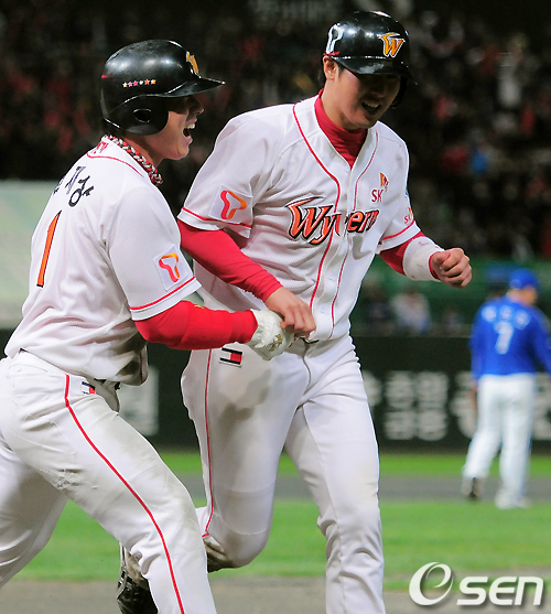 5회말 2사 만루 김재현 2타점 적시타때 홈을 밟은 최정과 박재상이 하이파이브를 하고 있다. /rumi@osen.co.kr