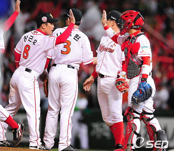 승리를 거둔 SK 선수들이 마운드에 모여 승리의 기쁨을 나누고 있다. /spjj@osen.co.kr