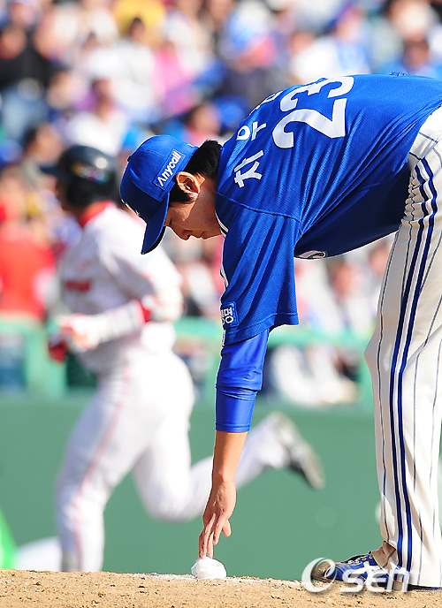 SK 4회말 무사 1루 최정에게 역전 투런홈런을 허용한 차우찬이 로진을 만지고 있다. /spjj@osen.co.kr
