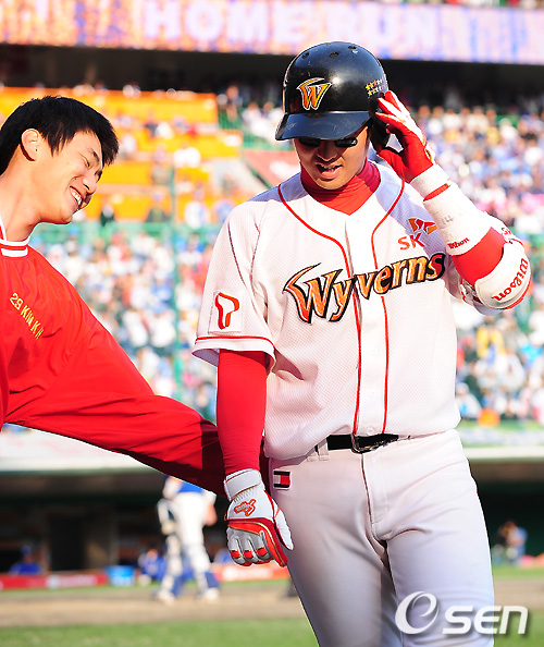 SK 6회말 무사 최정이 좌측 담장을 넘어가는 솔로홈런을 치고 홈에서 김광현의 환영을 받고 있다. /spjj@osen.co.kr