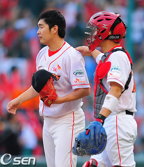 SK 박경완이 송은범의 어깨를 치고 있다. /rumi@osen.co.kr