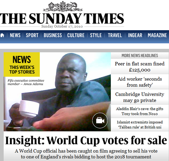 영국의 '선데이타임스'가 17일(이하 한국시간) 2018 및 2022 월드컵 개최지 결정권을 가진 국제축구연맹(FIFA) 임원이 지지를 대가로 금전을 요구했다는 사실을 증거 동영상과 함께 폭로했다.