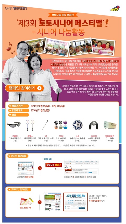 이번에 실시되는 행복나눔 10월 캠페인은 지난 달 29일(수) 스포츠토토와 서울 사회복지공동모금회, 한국노인종합복지관협회가 진행한 ‘제3회 토토시니어 페스티벌-시니어 나눔활동’ 에 총 1천만원을 지원한다.