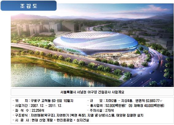 고척동 돔구장은 9월말 현재 약 20%의 공사 진척도를 보이고 있는데 2012년 초 돔구장으로 완공돼야 2012년 8월말~9월초로 예정된 세계청소년야구선수권대회를 차질 없이 개최할 수 있게 된다.